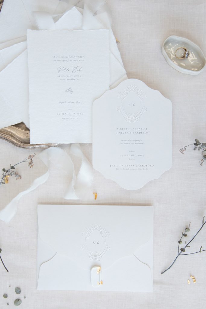 È un bianco che non grida, ma avvolge. Che invita a rallentare. Che trasforma ogni elemento della wedding stationery in un respiro estetico: leggero, calibrato, impeccabile.